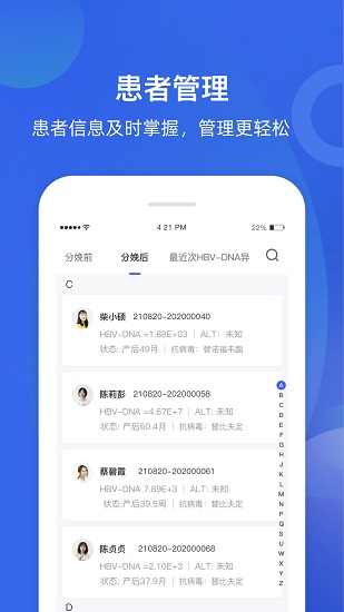 甘之兰医生端,乙肝慢病管理平台。是杭州芝兰健康有限公司专门为医生提供的在线沟通、患者管理、数据统计、门诊公告等于一体的乙肝服务管理平台。十分方便医生在线为用户答疑解惑,可以帮助患者更好的解决问题。统计患者各项数据,了解患者健康状况,定制专属乙肝慢病管理方案,提供实时图文沟通模式,一键快速回复患者,还能随时管理患者信息。