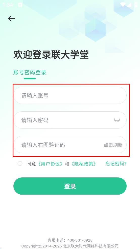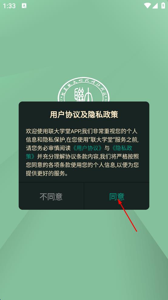1、打开联大学堂APP,会弹出用户协议及隐私政策页面,仔细阅读后点击同意按钮。