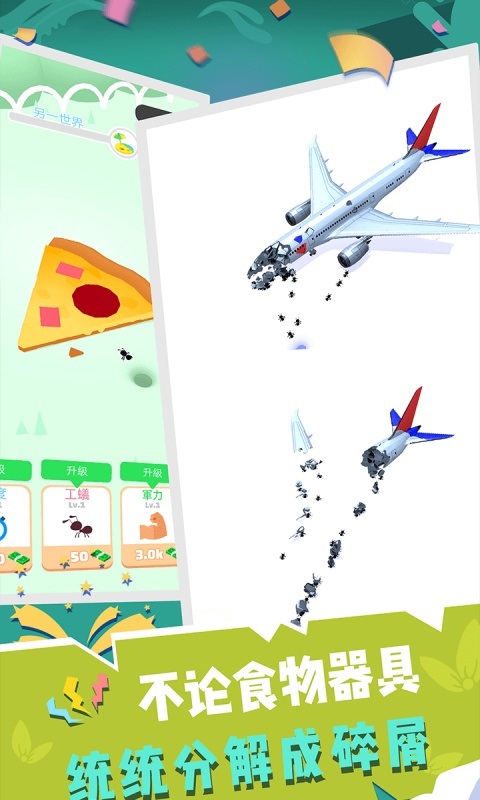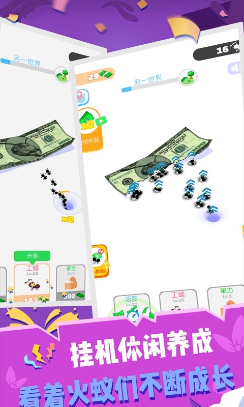 一款休闲放置小游戏,模拟的是蚂蚁合作运食物的场景。在这里,你可以购买蚂蚁,升级蚂蚁,提高效率,搬运更多的食物,游戏内还有许多新世界,都有玩家自己探索。
