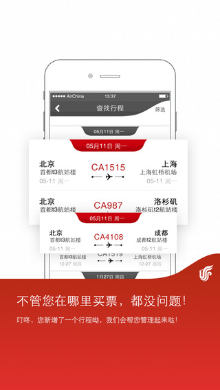 不管您在哪里购买的国航客票,不但可以查看自己的行程,还会有贴心的行程服务提醒。