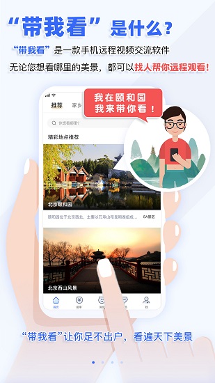 带我看是一个视频旅游的app,你可以在app上发布信息想看哪里的风景或者了解某个地方的建筑等等,在那附近的人就可以接单打开他的手机带你浏览附近特色,真正的做到了足不出户就可以游遍全国!你也可以帮助他人了解你所在地的风景特色,是一个非常便利的软件,快来下载体验吧!