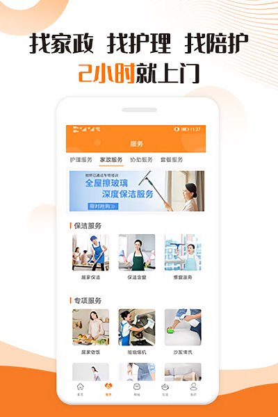 2、拥有协助服务、护理服务、家政服务等功能板块,找家政,找护理,找陪护全都有。