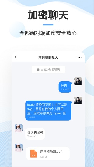 采用端到端的公钥加密方案,通信协议使用了高强度加密算法,保证通信安全。