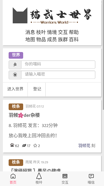 猫武士世界致力于提供优质的交流体验,以艾琳·亨特笔下的《猫武士》为世界观,走向书中那一片多姿多彩的世界。