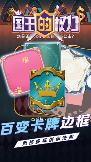 国王的权力是一款融合了迷你经营的策略卡牌游戏。游戏中玩家将扮演一位国王,利用手中的卡牌来推行一项国家政策。游戏中你会遇到形形色色的人物和各种稀奇古怪的要求,接收来自大臣、王后、先知等人随机提出的各种建议,上至政治要事,下到坊间流言。通过“yes or no”作答,来决定故事的发展,向右划为同意,左划表示否决。游戏玩法精彩有趣,你的决策将会影响一个国家的颠覆存亡。