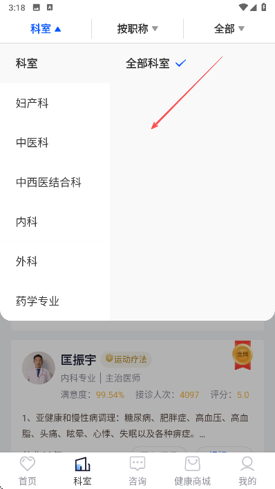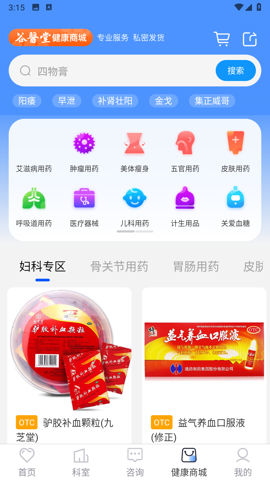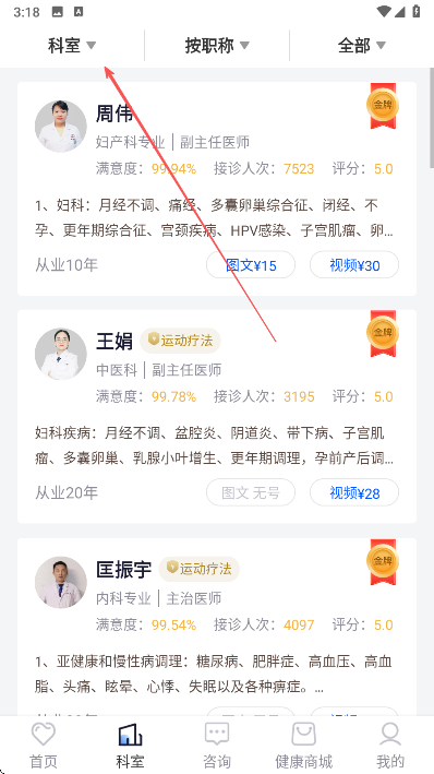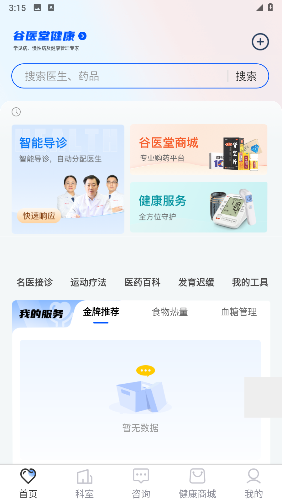 1、打开谷医堂健康APP,进入首页后,点击底部菜单栏中的科室选项,进入科室页面。