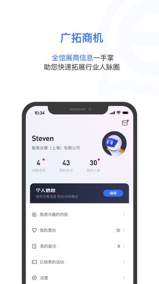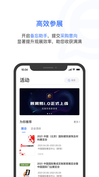 展贸易APP是为企业及个人打造的集行业信息、活动管理以及客户资源开发和维护的专业平台。集合行业活动资讯,活动组织及参与管理,客户备注及意向提交等功能模块,帮助企业与客户建立起更紧密的联系,助力行业人士开发并维护行业人脉网。