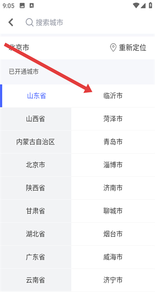 3、在手动选择城市界面,通过搜索或在已开通城市列表中找到并选择目标城市。