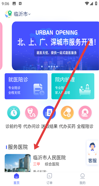 4、选择城市后,即可完成定位,在主界面查看该城市的服务医院等相关信息。