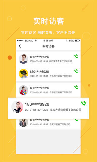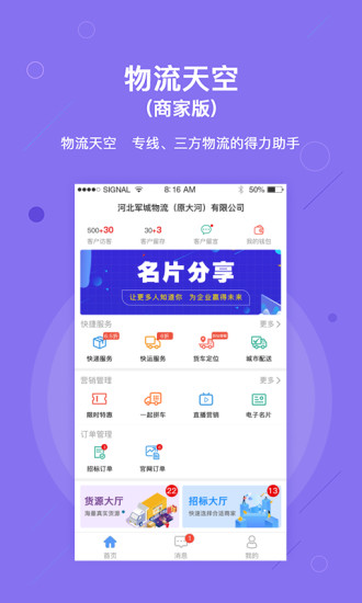 物流天空商家版软件适合物流商家使用,支持在手机上查看最新的货源订单,对于合适的订单快速进行抢单操作,还可以查看详细的访客记录,对客户进行编辑和管理,还可以在线分享自己的名片,欢迎大家下载体验!