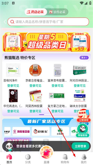 1、打开熊猫药药APP,点击底部我的,进入个人页面后点击立即登录。