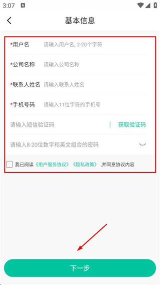 3、填写信息,输入短信验证码,设置密码后勾选协议,点击下一步,完成注册。