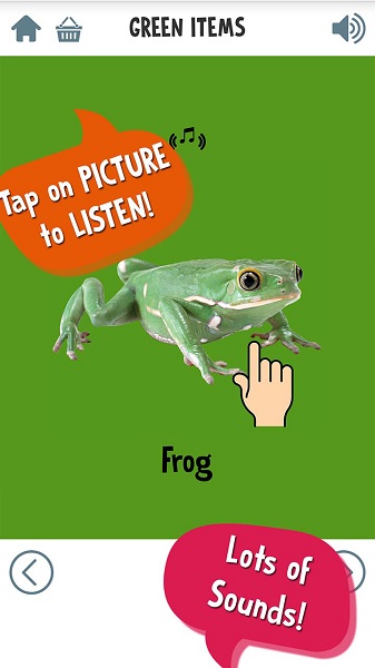 2、帮助小朋友看图识别颜色,在听说颜色的游戏中娱乐学习!在练习模式下,按颜色图案,就会播放颜色的名称,显示颜色名;在测试模式下,按颜色图案,说出颜色名字。
