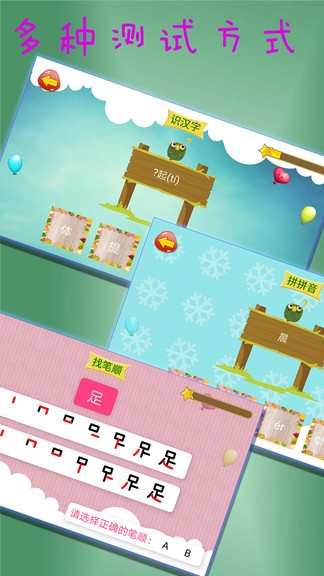 训练中心:便于儿童测试学习成果,利于记忆学习汉字。提供笔顺、拼音及汉字测试。