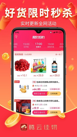 腾云佳物是一款超实用的手机购物app,平台里面汇集了各大商城的优质好物,所有商品分类齐全,方便用户更好的进行选择,每天都会有限时优惠券,让用户在这里可以省钱购物,足不出户就可以用最低价买到心仪的商品,在这里购物,不用剁手,想买就买,让你体验最划算的购物。