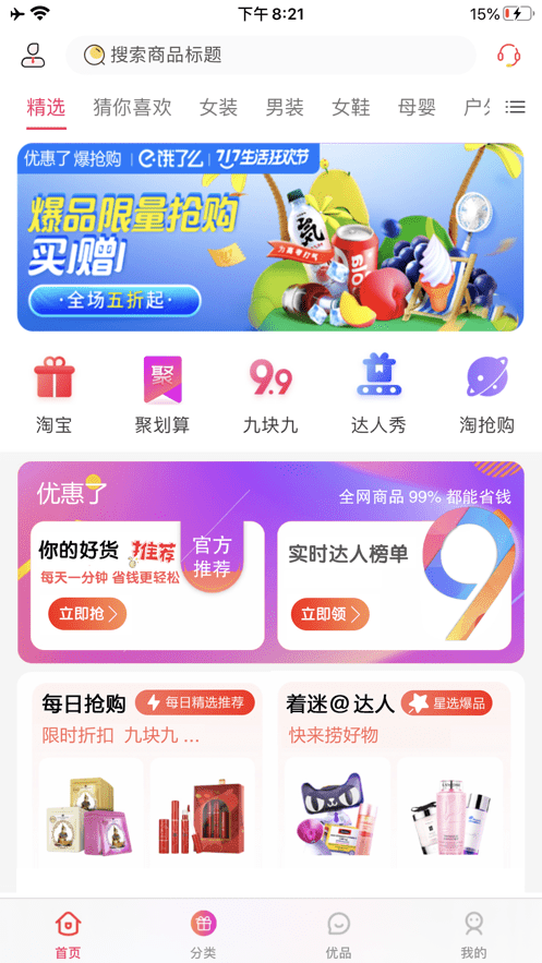 有的是限时秒购的商品,有的是9块9包邮,也有专门的新人免单的优惠福利;