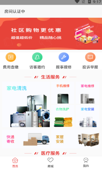 b、通过对社区周边店铺功能聚合,为业主提供费用查缴、访客邀请、报事报修以及周边商城购物的功能;