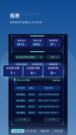 宇链科技自主研发的软硬一体化的区块链可信大师,实现巡检人、时间、地点、过程四位一体可信巡检全流程监管,通过存证在区块链上形成完整的全过程链条,可回溯、可审计。
