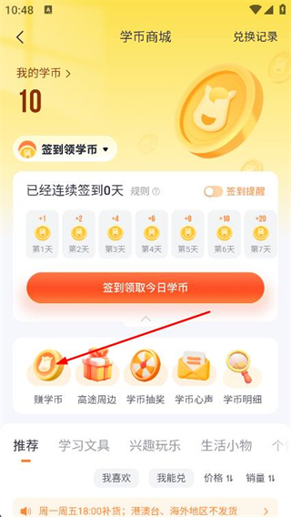 3、在学币商城页面,找到并点击下方的赚学币,进入学币攻略页面。