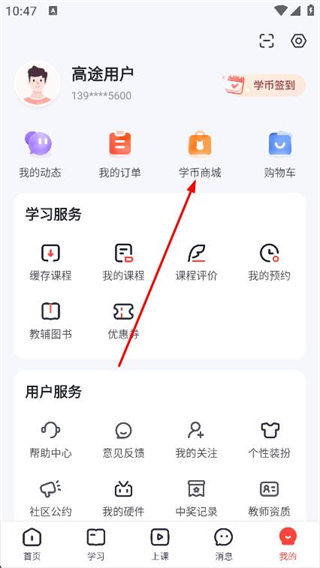 2、在个人中心页面,找到学币商城选项并点击,进入学币商城页面。