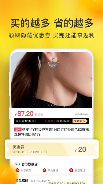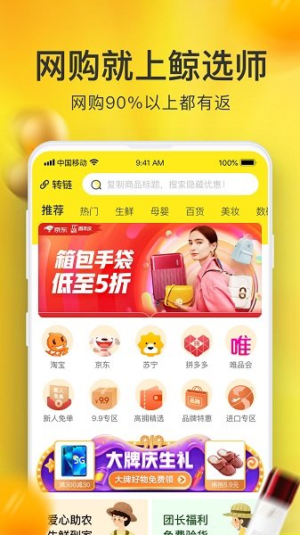 鲸选师是一款专业社交电商推荐APP,可以帮助用户网购优惠省钱,精选质优价美的商品,为消费者提供优质特惠商品和服务。平台整合了淘宝、京东、拼多多、苏宁、唯品会等主流电商平台,并且也涵盖了美团、饿了么、携程、团油等本地生活服务平台,旨在为用户提供优质商品和服务。领券再购买,淘宝天猫商品90%都能省