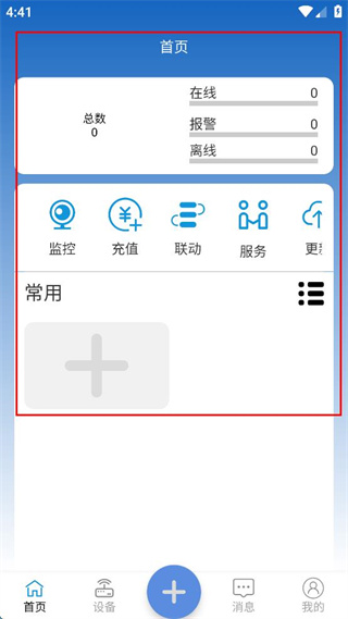 4、注册完成后进入首页,可查看在线、报警、离线设备数量及使用监控、充值等功能。