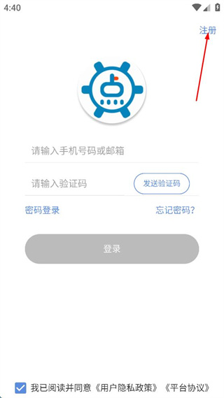 1、打开设备管理类APP,点击右上角注册,进入注册页面。