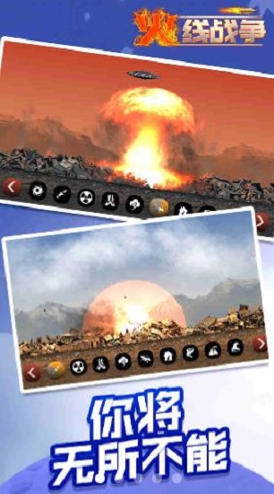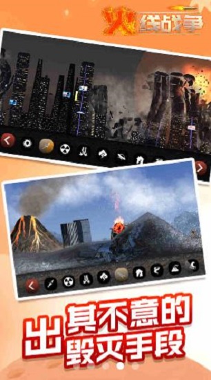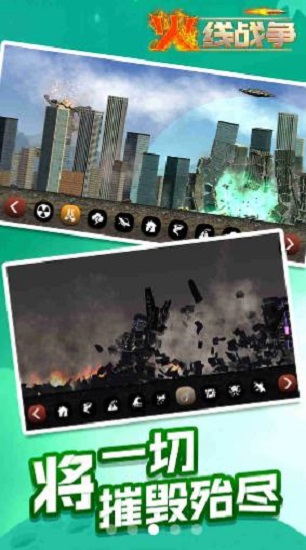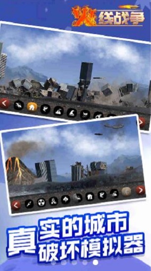 火线战争游戏是一款真实震撼的城市破坏模拟器手游,极致3d视野,绚烂真实的特效,不要眨眼,城市将在你手中摧毁殆尽!在游戏中,玩家要用炸弹将城市炸为平地,呼风唤雨,用潮水将城市淹没,甚至是召唤外星人和怪兽,将城市暴露在一切邪恶当中!