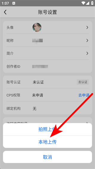 3、选择拍照上传或本地上传,选取要设置的头像图片。