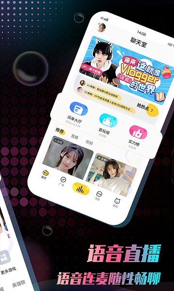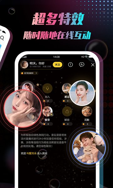 4、专为年轻人打造的个性化交友娱乐社区,24小时在线语音聊天室,让你找到中意的那个Ta。