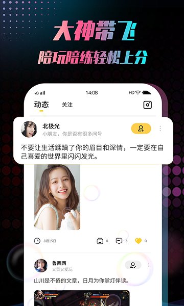 2、陪你打游戏,让你体验更多游戏乐趣,更有24小时语音聊天室、互动点歌等多种有趣的玩法。