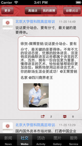 北大高端课iPhone版是一款专门为北大学生和对总裁研修课程感兴趣的商务人士建立的互动交流平台,并且可以和同学互动、查询课程等功能,让你的生活更加精彩!