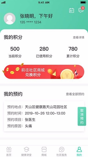 2、让用户健康智能生活,汇集了多种社区服务,包含了吃喝学医等方面的服务,还可以观看健康视频获取积分。