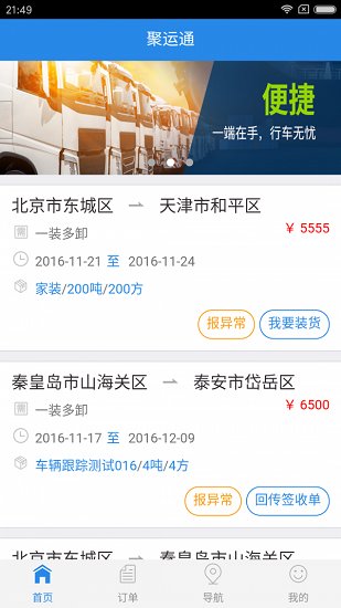 聚运通,是基于移动互联网的运力交易+车辆管理平台。应用“货运中包,运力管理”新理念,并借助移动互联网和大数据技术,聚运通致力于为运力供求双方提供标准高效的运输交易和运力管理平台,聚运通,开启物流新体验;