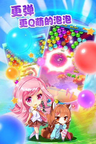 1.二次元超萌画风,动漫全出击:游戏使用了精美的二次元动漫风格,每一个场景都以卡通方式展现,而射出的泡泡都有独特的动感形态,玩家可以一边欣赏美景一边进行充满动感的泡泡龙游戏。 不仅是场景的设计,《泡泡龙萌星大作战》在人物及关卡设计方面也采用了日系二次元动漫风格,游戏中出现的每一个BOSS及主角妹子都是萌萌哒!