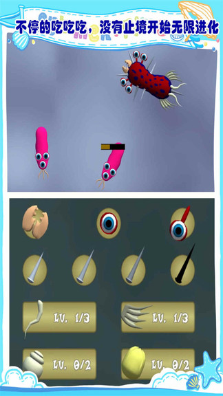 《迷你昆虫世界》是一款卡通风格的休闲模拟类手机游戏,用简单有趣的动画生动的呈现细胞进化的奇妙过程。游戏玩法很自由,细胞都是可以自由定义的,给它们加上眼睛、嘴巴以及钳子或者脚等,接下来就是保证它们能够成长和安全进化,消灭它们的各种天敌,战斗过程很紧张,吞噬更多的食物或者其它生物,经历重重困难完成升级,最终会变成意想不到的强大物种,游戏图形很精致,玩起来很愉快。