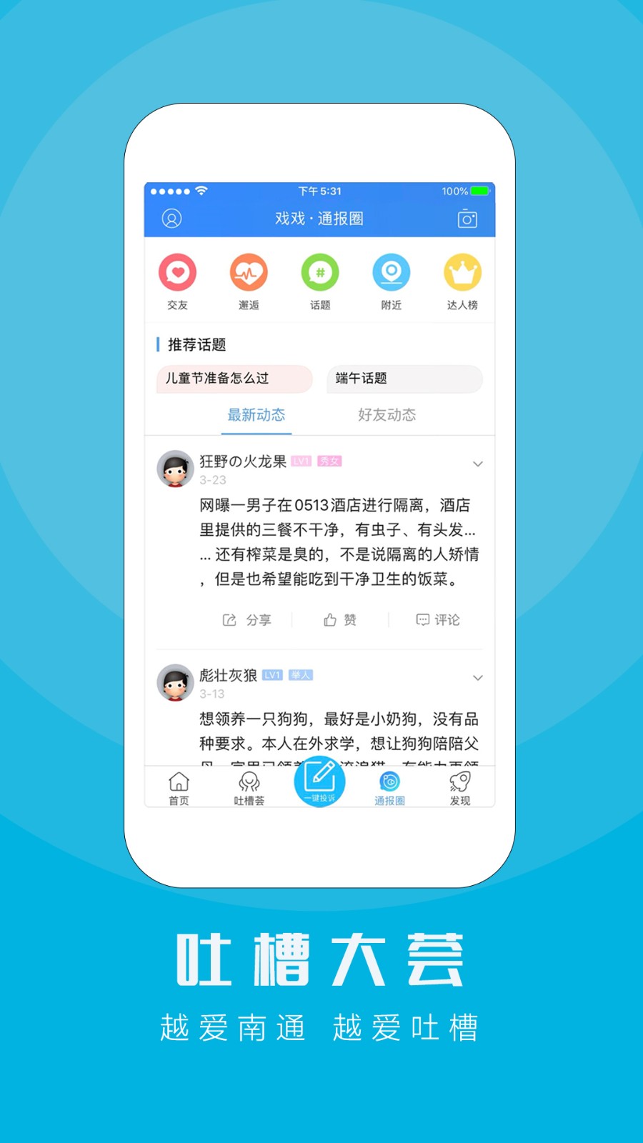 鞭挞假恶丑,讴歌真善美。心系民生,为民解忧。江海通报APP——汇集爆料、投诉、维权、吐槽、表扬等于一体的南通民生服务客户端。专为当地用户提供有价值的专业权威资讯新闻头条和热点民生报道,传递正能量,建设更美的城市。