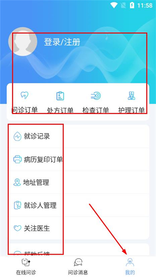 3、个人管理功能全面,登录后查看问诊订单、处方订单、检查订单、护理订单等,还能管理就诊记录、病历复印订单、地址、就诊人,关注医生。