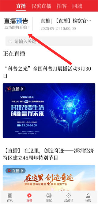 2、在直播板块页面,点击直播预告,进入直播预告列表界面。