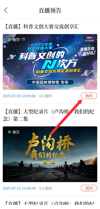 3、在直播预告列表中找到目标直播,点击其右侧的预约按钮。