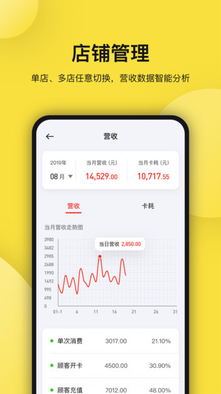 1、单店、多店任意切换,老板、店员可在APP上随时查看门店经营状;