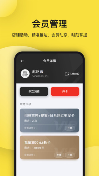1、在此可以管理店铺、管理员工、管理会员和管理账目;