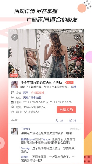 参加主题活动还能发帖子留言板留言,与同城网摄影师一起线下推广互动交流;