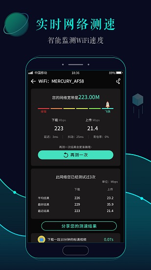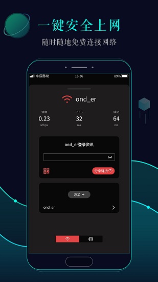 全能WiFi钥匙作为wifi管家可以【连接网络】,【360°WiFi安全检测】,创建【WiFi钥匙热点】,【网络测速大师】,【WiFi密码查看】等,极速好用,帮助用户节省更多流量,作为加速助手,WiFi测评分析大师,是真正的万能WiFi钥匙大师!