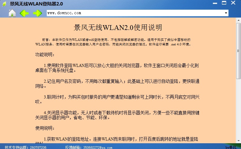 景风无线WLAN登陆器是一款用来登录WLAN和wifi的客户端,有了它登录关闭以后都非常的方便,记住密码功能让你可以随时随地的登录,适用于购买了类似中国移动的WLAN服务,使用时需要在浏览器输入用户名密码,而能关闭浏览器的情况。需要注意的是本软件不包括或解密功能,软件运行需要 .net 4.0 环境。