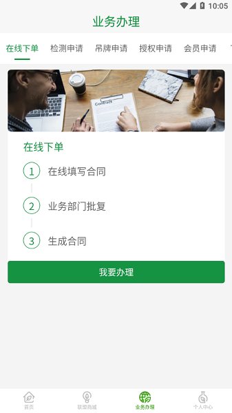 业务办理:可实现在线下单、检测申请、吊牌申请、授权申请、会员申请等业务办理;