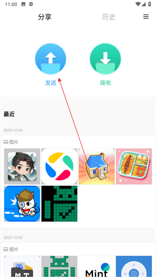 1、打开小米快传应用,进入分享页面,点击页面上方的发送按钮,进入选择文件的页面。