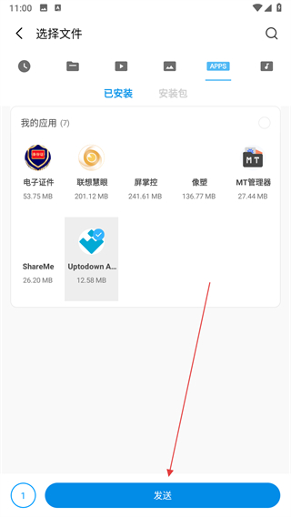 2、在选择文件页面中,切换到应用分类,找到要发送的软件并选中,点击底部的发送按钮。