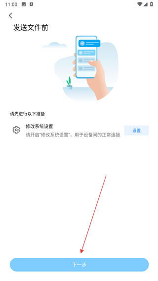 3、在发送文件前的准备页面,按照提示完成系统设置修改,点击下一步按钮继续操作。
