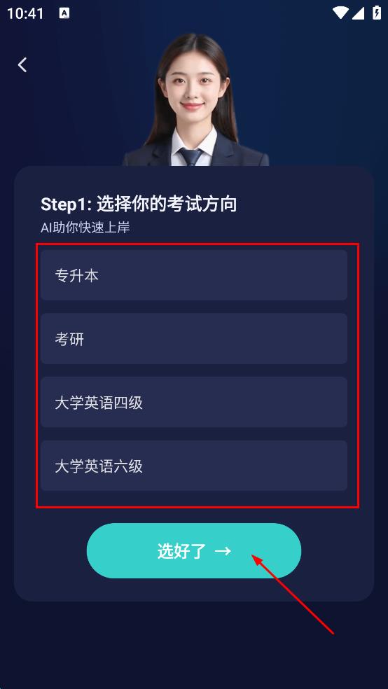 2、进入选择考试方向页面,选择要备考的考试方向,然后点击“选好了”按钮。